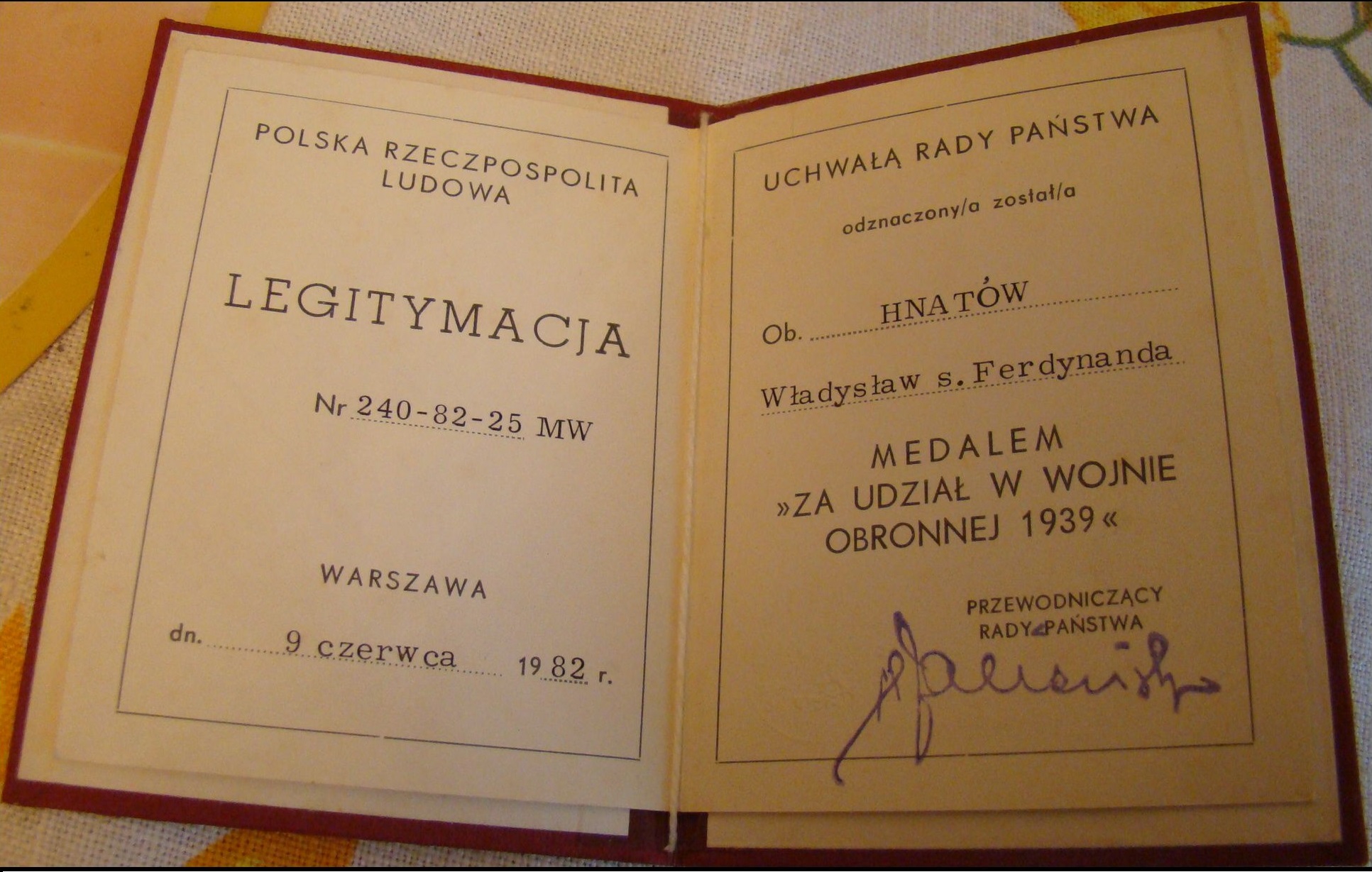 Medal „Za udział w wojnie obronnej 1939” otrzymany przez Władysława Hnatowa